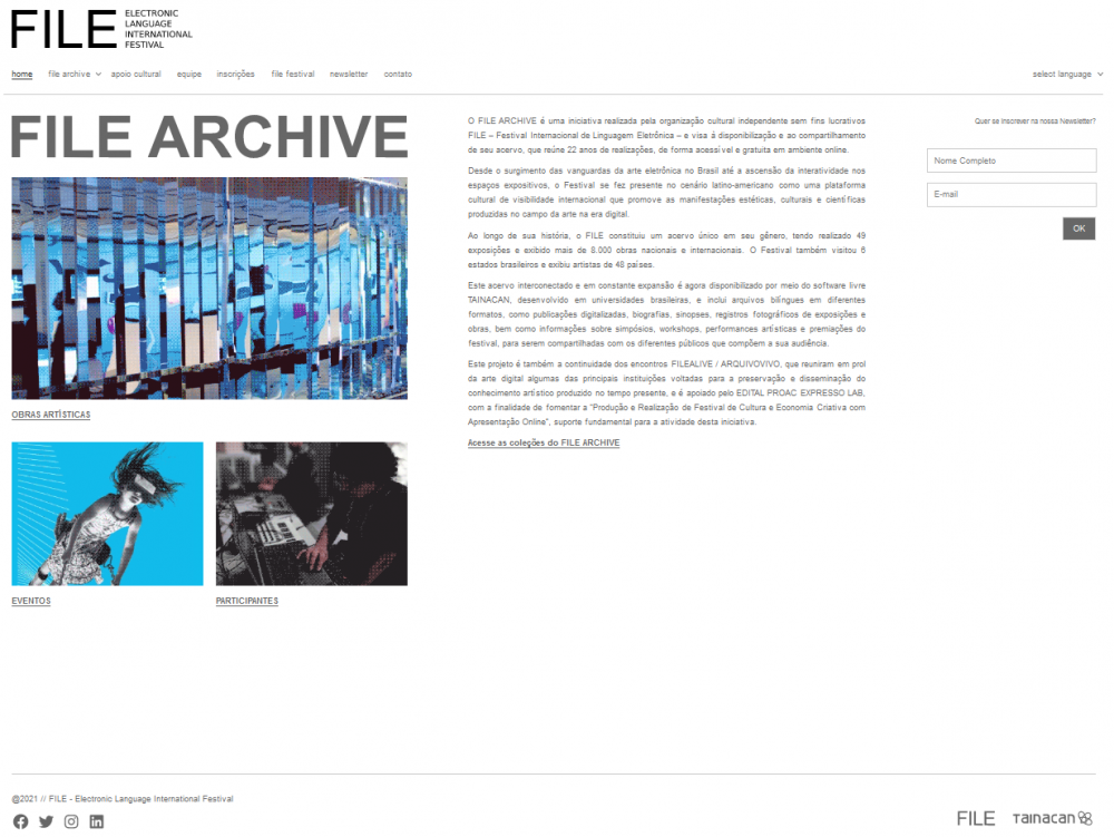 FILE is a non-profit cultural organization founded in 2000 with a main goal of promoting and motivating the research and art production on electronic language, as a way to set a space to discuss and promote Art and Technology culture in Latin America.
