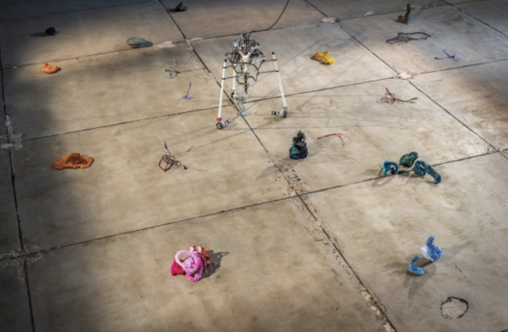 The exhibition RE:PLACES by EMAP artists Carolin Liebl and Nikolas Schmid-Pfähler presents unusual, multicoloured warping objects and a complex apparatus resembling a three-legged planetary landing module, engaged as a partner in creating a visceral experience of plastic processing. The performative installation explores the life cycle of plastic materials and speculates on alternative circuits of (artistic) production, where objects created during an exhibition can be repurposed again as raw materials.
