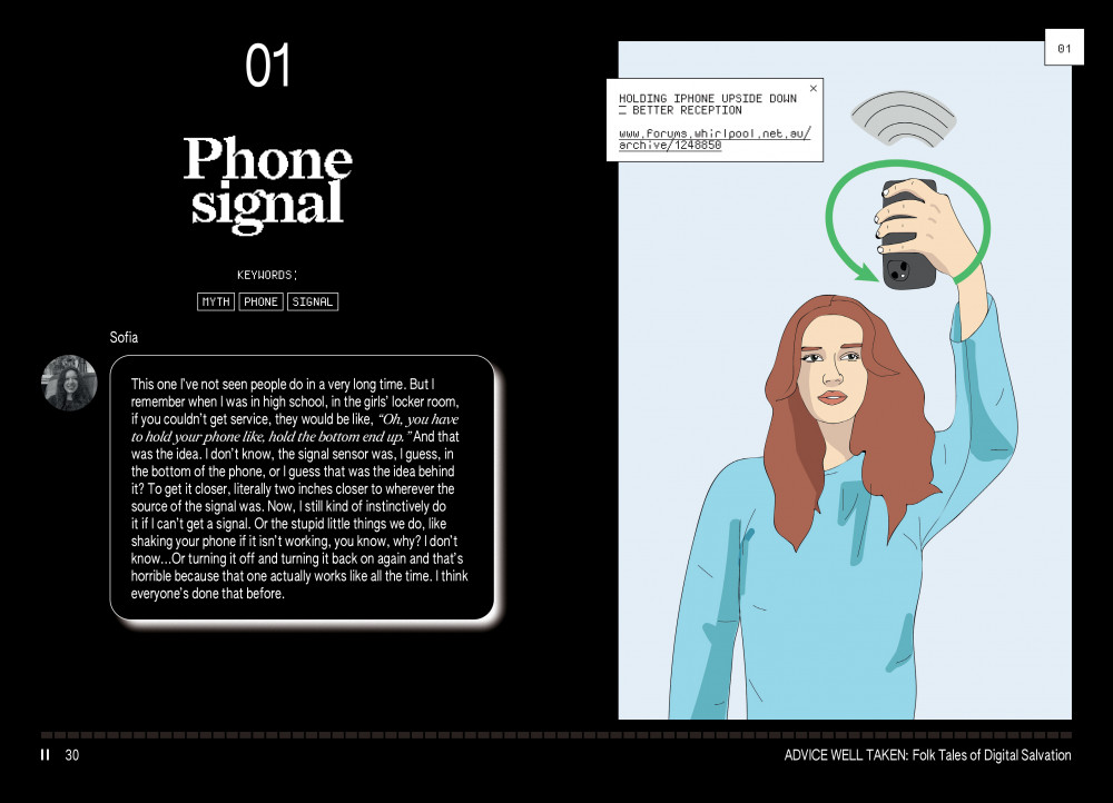 Drawing on online as well as community resources, ADVICE WELL TAKEN: Folk tales of digital salvation by Dasha Ilina intends to create an ethnography, documenting the folk strategies around the uses of technology, with a specific focus on saving damaged or dying devices, and the sharing of mythologies to explain the obfuscated workings of algorithms used in social media applications.