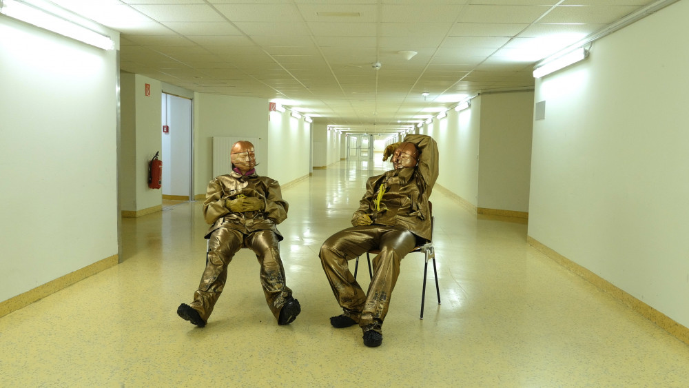 Additionally, T(n)C will show their performance Dreams Beyond the Grind for the first time at their residency host: Dreams Beyond the Grind is about two figures in golden work uniforms who sit on molten white plastic chairs and rest. They observe the activities around them, while their always closed eyes seem to gaze into the distance- until an alarm interrupts the tranquility, calling them back to work. The performance Dreams Beyond the Grind narrates a fleeting moment of silence, questioning what remains hidden beyond routine and the everyday grind.