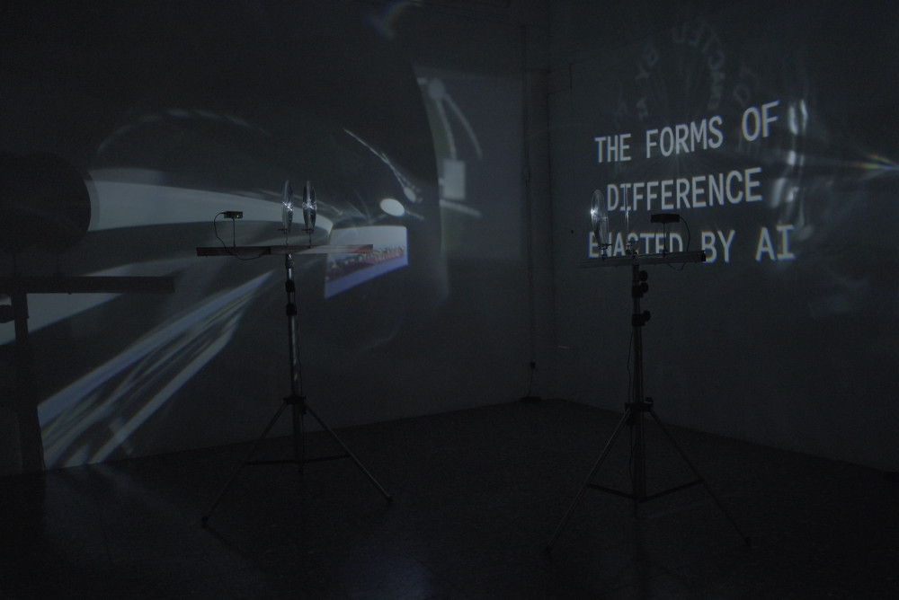 A Structural Plan for Imitation: Engines of Differentiation looks at how what is visualized through artificial intelligence is warped through machine interpretation. It questions the value systems embedded in artificial intelligence systems and how these lend themselves to the cultivation of difference. In the two-channel video installation, digital projections exploring the hyper-visuality of AI imagery are distorted through a series of fresnel lenses. Applying strategies of détournement to the images behind the images, and machine learning training datasets, the piece brings viewers into the complex relationships artificial intelligence creates between the visual and nonvisual, data and images.