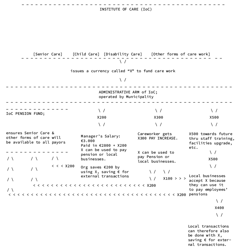 Money is not a fixed object; it is a representation of rights to resources, and as such it is a social medium. It is a medium that shapes much of society. This project approaches money as an artistic medium and constructs a model for a care-based economy, with a specific focus on financing elderly care.