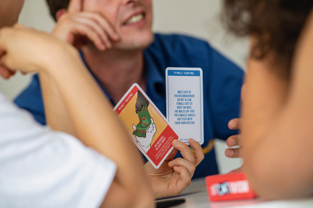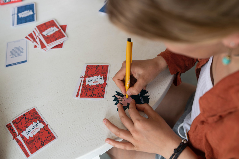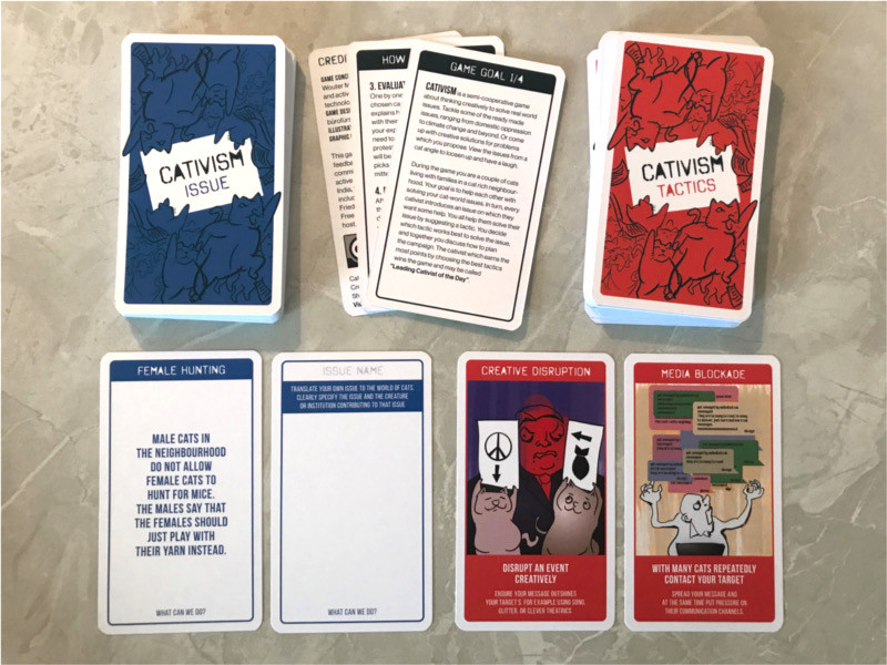 Each player in turn is the Leading Cativist and introduces an issue. As a group of cativists, you all help to solve this issue by suggesting creative activism tactics. You then discuss these tactics and plan a campaign together. The cativist who earns the most points by proposing the best tactics wins the game and earns the title of “Leading Cativist of the Day”.