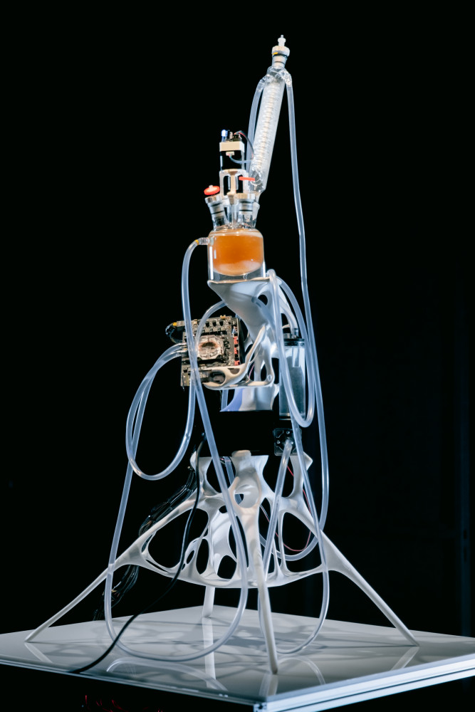Based on topological optimization algorithms, the sculpture-machine consumes electricity and transfer heating across the bioreactor to the microorganisms, transforming invisible energy to form by organic life. The form emerges from entropic equations and mathematical discoveries of the 'natural world'; it reminds us of arranged bones or tree branches. We have come full circle, from the mathematics of nature to Prigorin's chaos and physics: from the possibility of this type of life form on earth to (bio)mimetic... to the reaction-diffusion from the living matter development to the AI imagination "dream."