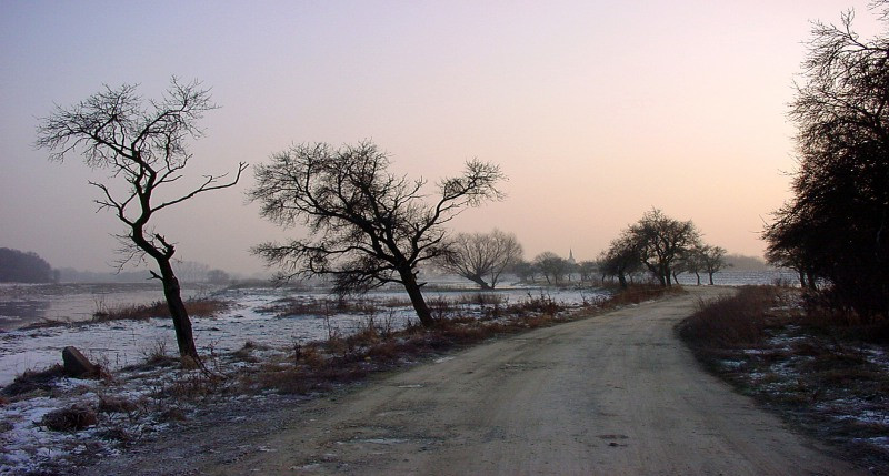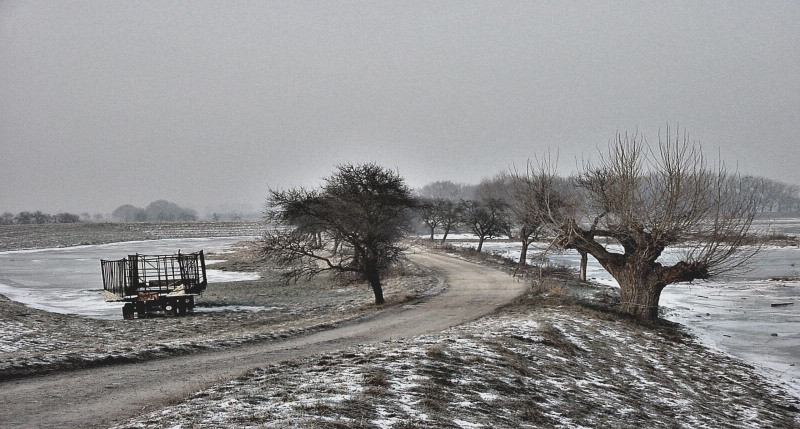 It takes its title from the name of a road which ran from the village of Tornitz to the river. Ein Anger in German is a village green or shared pasture for the village animals, cattle and horses. I was first struck by the play on the English word "Anger". At the end of the road was a flooded wood that sat just under the dyke by the river. In the sub-zero temperatures of that winter the water had frozen, and the ice would crack under pressure, sending dopplers of sound skittering through the trees. Hard by it on the river itself, turning ice blocks could be heard crashing and slithering against each other as they moved downstream. The "Anger" for me became then the hostility and hardness of the natural environment the villagers were pitted against, and came to symbolise a larger idea concerning the hostility of the historical processes they had been subject to from the start: from the first settlements of the area by German speakers in competetive lebensraum conflict with the Slavs on the other river bank, two cultures facing off, stopped in their onward progress by each other (and so much of subsequent German history can be seen to generate from that fact), via Nazism, then the Stasi state, to the present, often untender demands of the global market on an economy still reinventing itself away from Five-Year-Plans and the idealised production targets of the apparatchiks' fantasies.