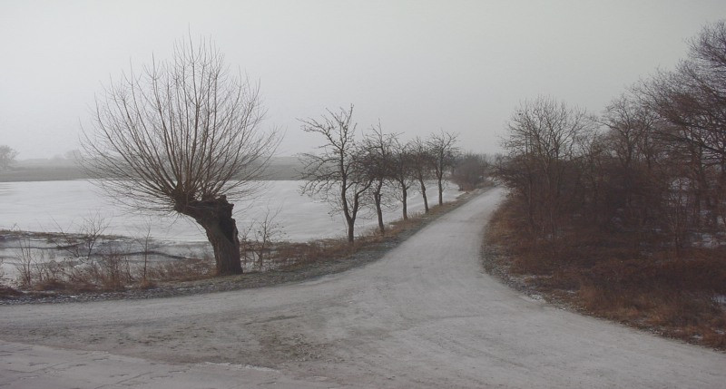 Here at this bend, the Saale flows freely. In 10 Kilometres it will flow into and merge with the Elbe. Not far downstream, the surface of the Elbe is partially blocked with ice drifts. The river floods its banks and deluges the fields for hundreds of metres to either side. Other ice blocks break free and carry on. The strong current takes them north, towards the sea.