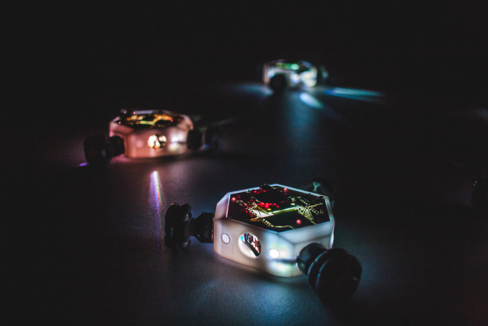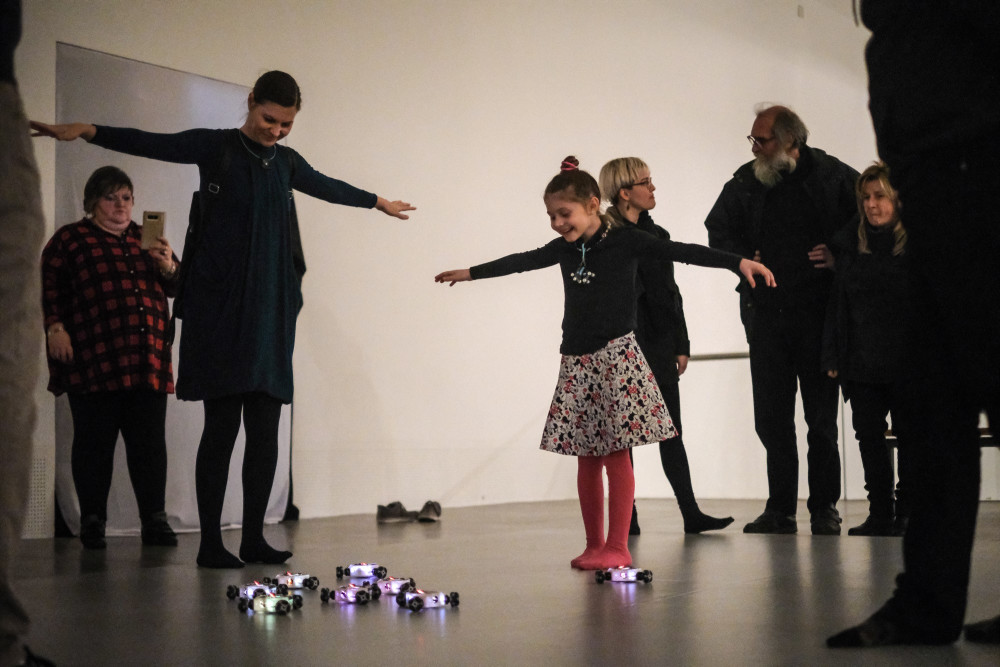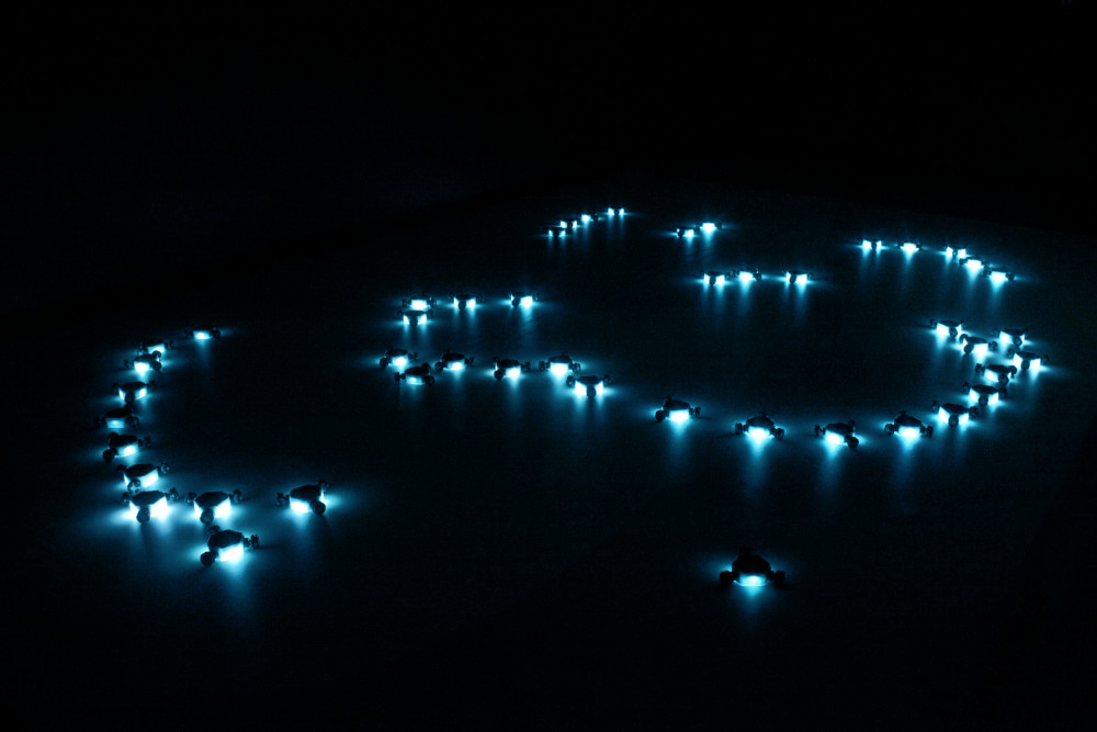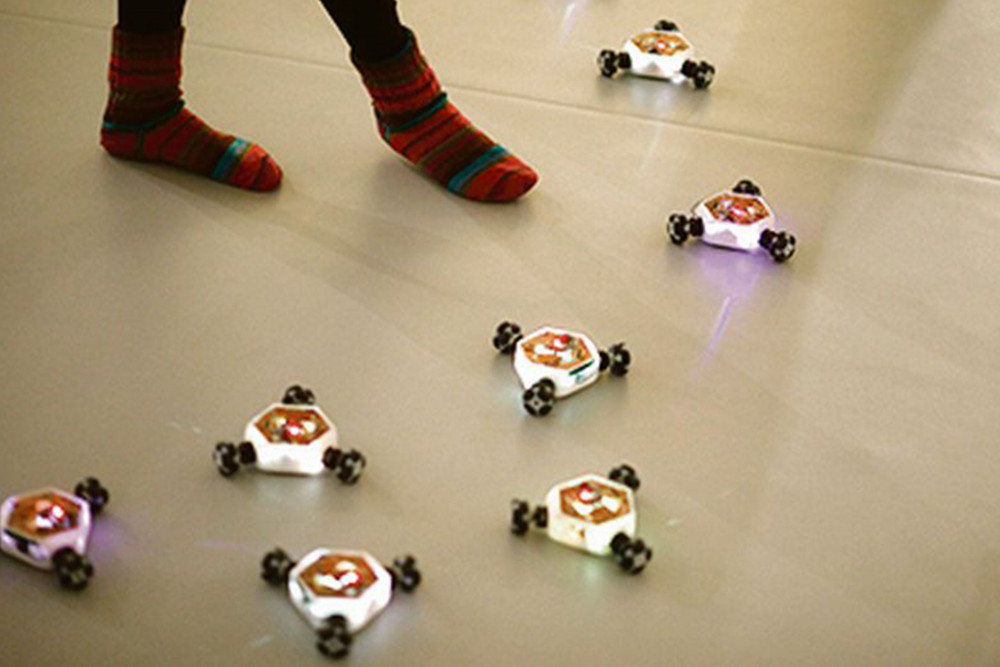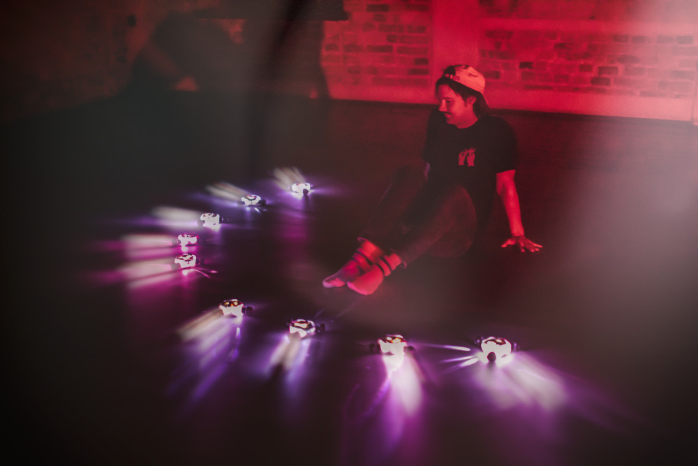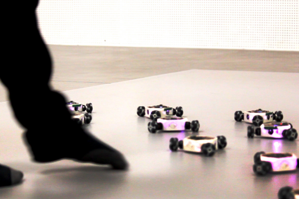 Can robots feel empathy? The Artists Katrin Hochschuh and Adam Donovan address this question in their installation. A swarm of 50 robots adapts its behaviour and interacts with the observer using emotion recognition algorithms and camera tracking. Its formations, animations, and movements become the language of swarm expressions. The goal is to use deep learning to train the robots to respond compassionately to people’s facial expressions. As an antithesis or extension to humanoid robots like the famous “Sophia”, the artists show that non-anthropomorphic robots can also learn and produce a feeling of empathy and compassion. With a simple animated film, the psychologists Fritz Heider and Marianne Simmel had demonstrated back in 1944 how easy it is for the observer’s brain to associate emotional attachment to inanimate objects and how the human brain is hardwired for compassion. Based on this research, the installation is an experiment and social test on human-robot interaction.