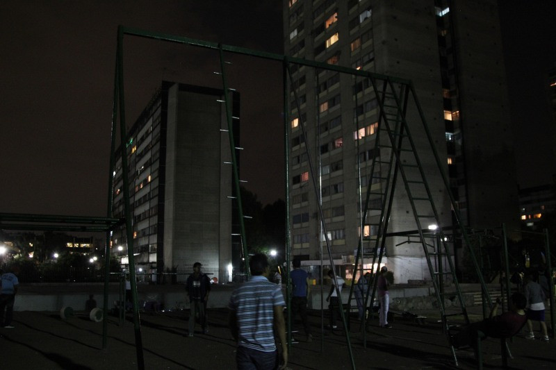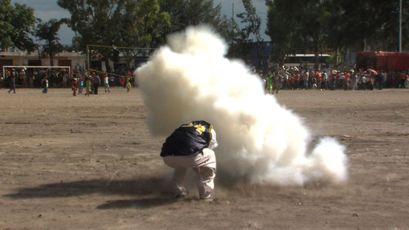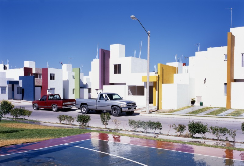Kathrin Kur presents a photo series and two videos from Mexico City. The photo series Fraccionamientos portrays the boom in standardised housing estates in Mexican industrial centres such as Aguascalientes and Chilpancingo. These heavily guarded compounds are reminiscent of the reglemented architecture of modernism and shed light on a country influenced by American capitalism and living in continuous fear of criminality. Tlatelolco borders on Tepito, the most dangerous area in Mexico City. In the Mexican psyche it remains darkly burdened as the site of the student massacre of ’68 and the catastrophic destruction of the 1980s earthquake. Against this background, the video pieceTlatelolco (El Andamio) shows an acrobat whose nightly training in a public sport facility becomes a contest against himself. A further video piece Blow Up investigates the striking religious re-enactments and performances surrounding the explosive hammer ritual, which takes place annually in the village of San Juan de la Vega, Guanajuato.