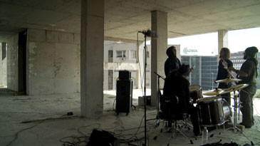 A heavy metal band is seen rehearsing on a deserted building site, in front of Sofia’s business centre; the view is rhythmically interrupted by footage of the sharp-edged architecture, shot from steep angles. The thick sound, characterised by highly amplified distortion, echoes throughout the building site while the band members address one another, thereby defining their relationship to and interpretation of the surrounding cityscape.