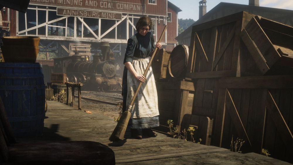 Hardly Working gives priority to characters that normally fade into the background of video games: NPCs. NPCs are non-playable characters that populate hyper real worlds to create the appearance of normality. Usually these digital extras play no major role in the story of the game. Here a laundress, a stableman, a street sweeper, and a handyman are the four main characters of this film. With ethnographic precision, the film observes their daily work: a rhythm composed of loops that makes them work daily and tirelessly. Their work neither results in a product, nor does it change anything about their status quo. In light of Hannah Arendt description of ‘animal laborans’ – in contrast to the acting subject –, the NPCs as individuum are an exaggeration as their work performance actually manifests their status.