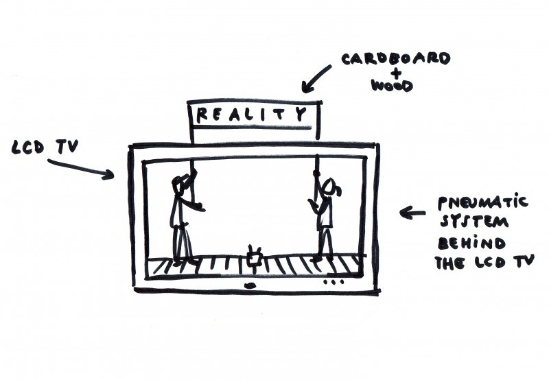 The Box (2005), shown recently in the 2009 Sharjah Biennial is a video installation in which the artists are trapped in a fictive space – in this instance, inside a rubber encased monitor. Frustrated, they attempt to physically beat their way out to the outside world. A pneumatic contraption lies under the rubber and is timed to work in unison with the futile actions of the human protagonists on-screen. As Oblak appears to punch at the walls, the rubber film flexes and responds with protrusions. There are clear allusions within the work to the position of the individual in terms of the technological controls inherent in the mass media, and the grip the media has gradually established over the individual through such controls. Preceding the residency for EMAN by four years, the core theme of the work nevertheless isolates the artists from the outside world through entrapment within a media construct of their own making.