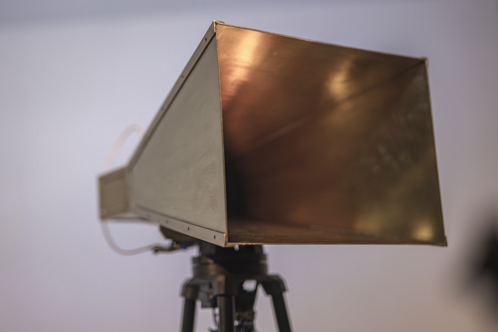 Materials: brass horn antennas, RF amplifier, custom analogue circuitry, motor, tripod, sound system