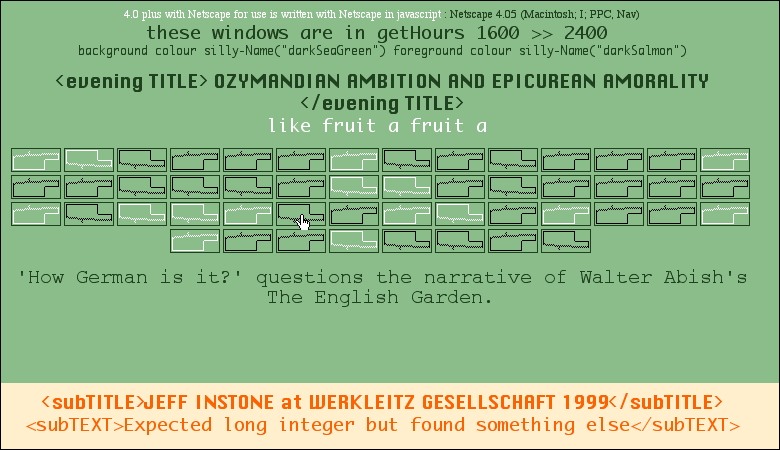 With up to 50 windows, the work uses JavaScript devices such as window localisation and movement, rotating frames, multiple mathematical arrangement stores with random selection, time-based transformation and regeneration, layered text and cascading style sheets. The work was made possible by financial support from the Saxony-Anhalt Ministry of Culture, the British Council and Southern Arts (UK).