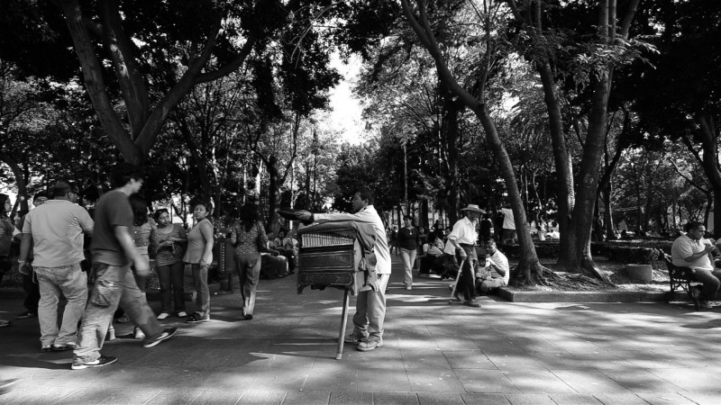 Diego Rivera’s giant mural Sunday Dream combines all social strata and all periods in a utopian nostalgic reminiscence of youth. The work was commissioned for the Lobby of the Hotel del Prado in 1947, which was partially destroyed in the 1980s earthquake and has now been renovated and to which a museum has been added bordering directly on Alameda Park. Mexico’s revolution from 1910 was “institutionalised” in Rivera’s time under the leadership of General Díaz. The viewer sees an Organillero in simple revolutionary uniform. The more than 100 years of use have inscribed themselves into the tone. The constant grinding has altered not only the intonation but also the score, sown into the barrel in the form of rods. The resulting sound is more than a mere medial shadow – it is a rhythmical and melodious variation on the former themes.