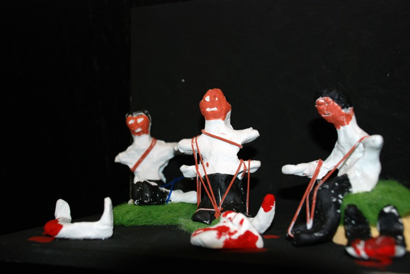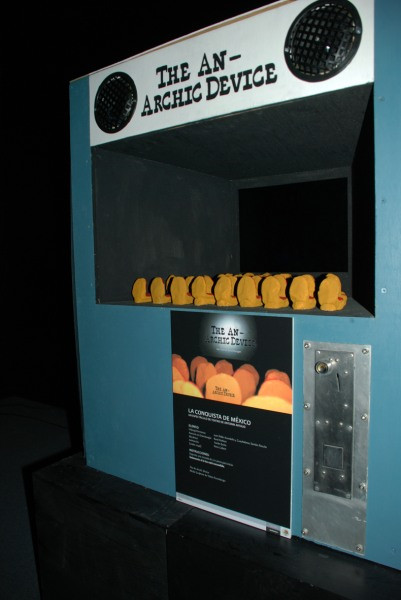 Based on Antonin Artaud’s theater manifesto The Conquest of Mexico,The An-Archic Device deals with Mexico as a space of otherness and as a subjective heterotopia. Following Artaud, Mexico becomes the playground for an examination of danger and fear. The An-Archic Deviceintroduces itself to the spectator as a kind of Punch and Judy show. During the standbymodus of the installation its display remains dark, while the audience is listening to an audiotrack based on the first part of Artaud’s manifesto from 1933. After somebody has put ten pesos into the coinslot the second part of the text is staged in a multimedia light and picture show. The final result is a multilayered and hybrid theatre model that reenacts Artaud’s theatrical examination of “Mexico” on a small scale.
