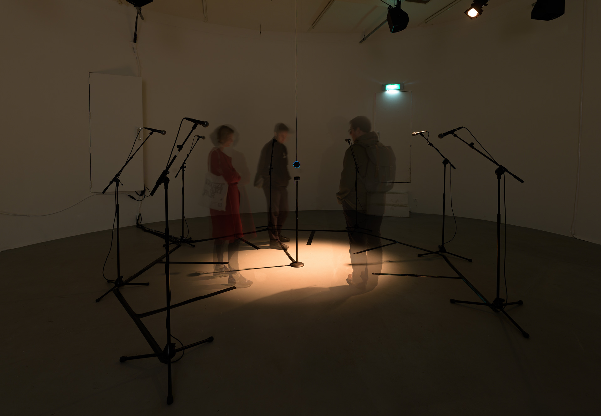 The Dark Age of Connectionism explores the hidden capacities of always-listening devices like the Amazon Echo, and how we may understand the opaque systems behind them. The microphone array inside an Amazon Echo captures not only what is being said to it, but also the approximate position of the speaker in the room, and what music is playing nearby. With the right analytics, this could reveal the footsteps of those in the room, what type of devices are being listened to, or whether voices are raised in anger. Due to the secretive nature of Amazon’s systems, we cannot know whether these or any other discrete analytics are being performed on the sonic data being constantly poured into these always-listening machines. The Dark Age of Connectionism is built around an Amazon Echo suspended in a room, which is being asked questions by ‘Siri’ – a speaker mounted beneath it. Each of the 200+ questions offer a way to critique the Echo, and a question is asked every time a sound from the audience is detected, captured by a series of microphones and vibration sensors installed around the device. Snippets of these sounds are played back around the object, creating disembodied voices of those audience members who have been before.