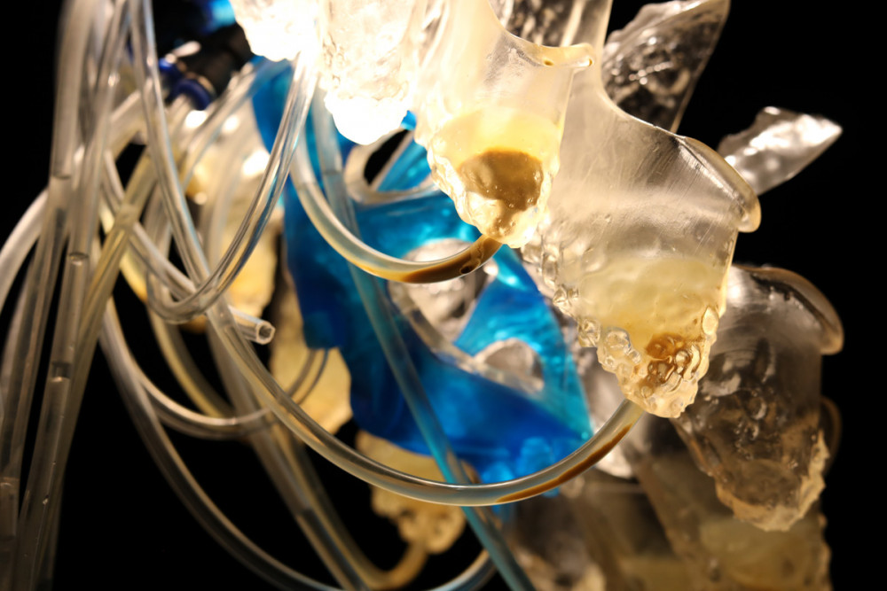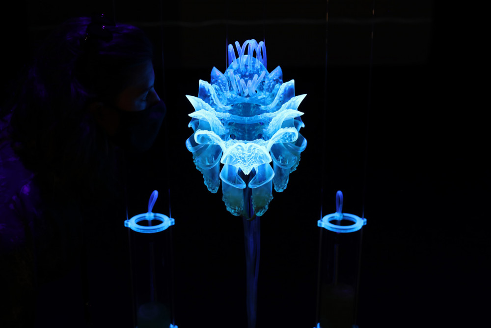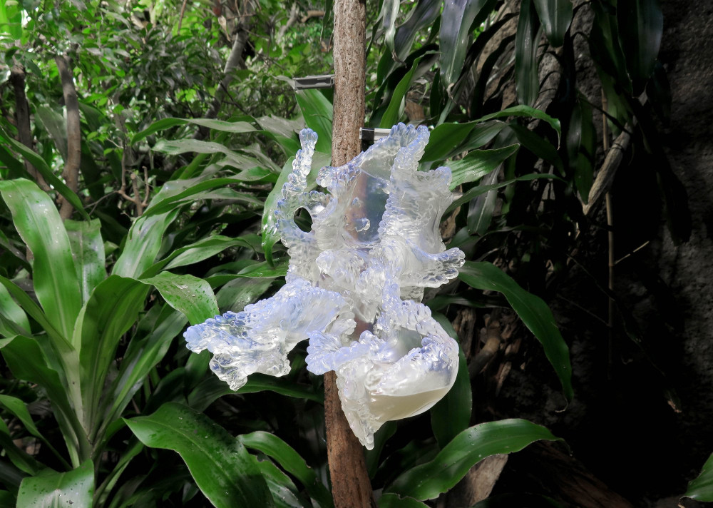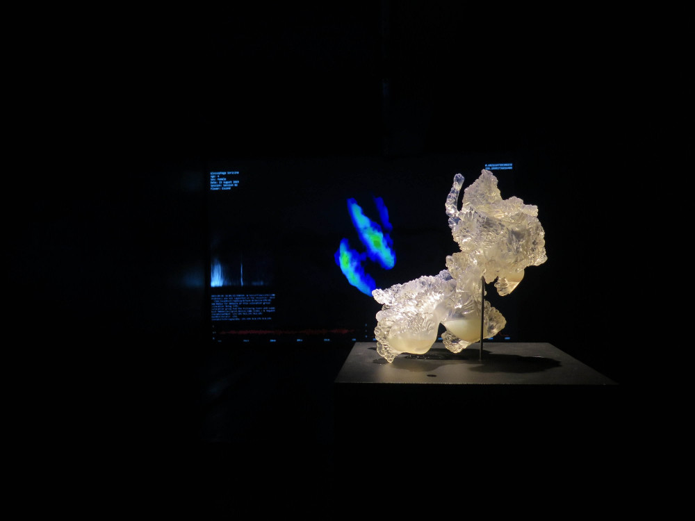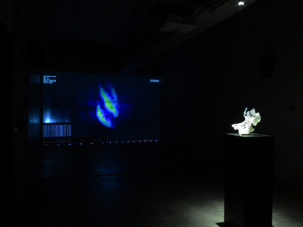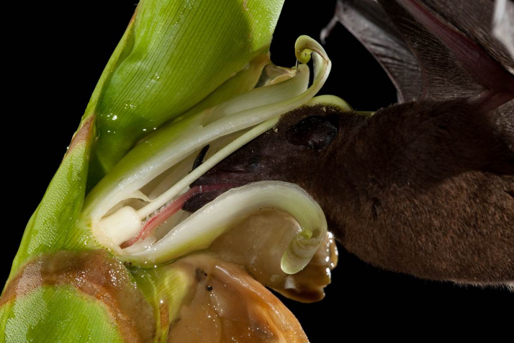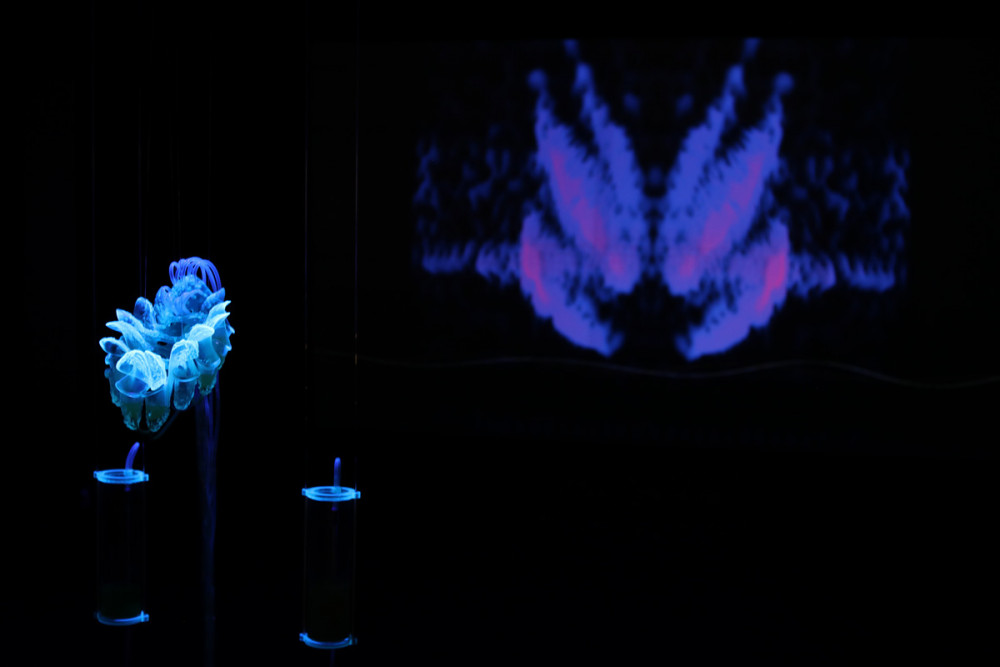 This multimodal piece explores non-verbal communication between humans and bats, through the study and the translation of the bat’s sensorial systems. While humans distinguish fruit from foliage visually, bats don’t: Nectar-feeding bats find flowers by sorting the environment using visual and sonar information. The geometry of a single flower can be recognised by generating ‘echo-fingerprints’. These fingerprints are translated into audible frequencies and visual, sensual patterns comprehensible to human senses. The aim is to transcend human limitations by exploring the deeper meaning of mutual relationships and interspecies communication between humans and animals, the animal's gaze in juxtaposition with the human gaze. The work translates the nectar bats’ perceptual world into perceptual patterns a human can understand – from echolocation to our senses such as hearing, seeing, and touching.
